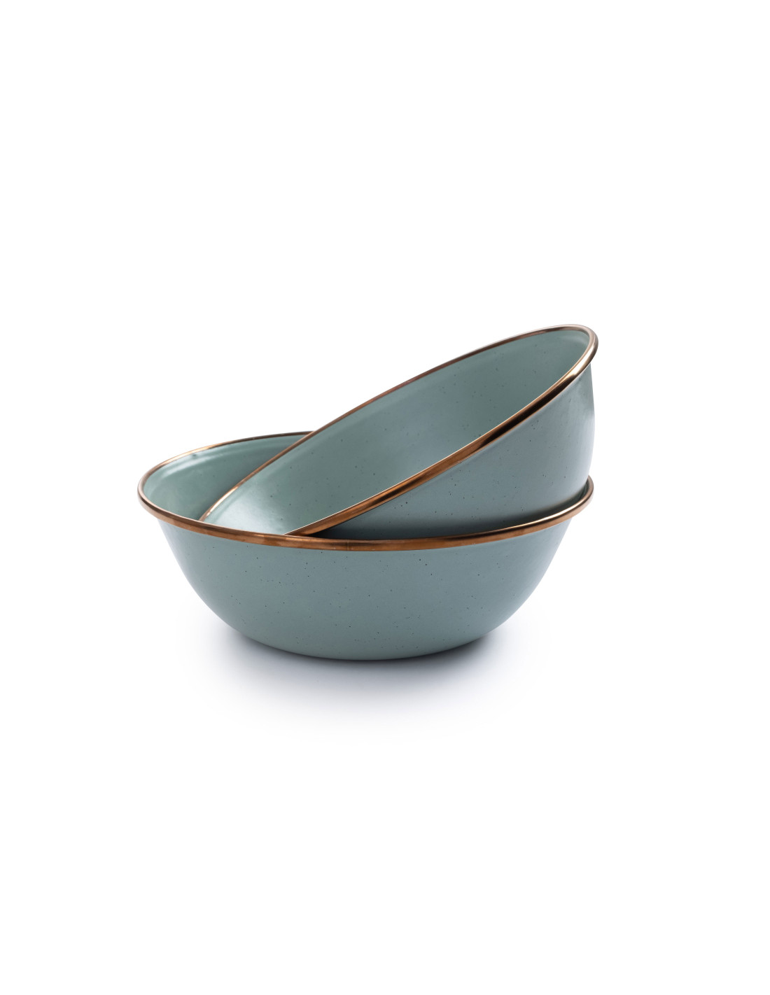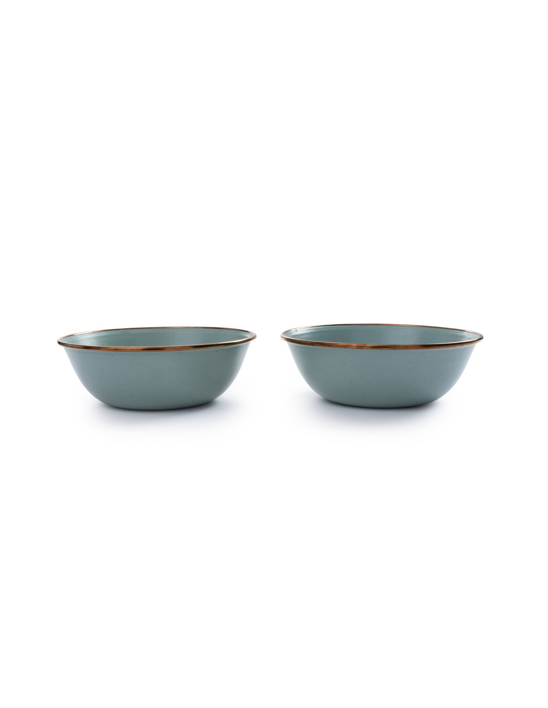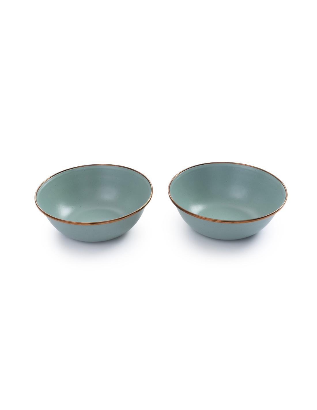 Set de 2 bols en acier émaillé avec la bordure en cuivre finie à la main. Chaque pièce est unique et elles forment un bel ensemble réunies sur la table.