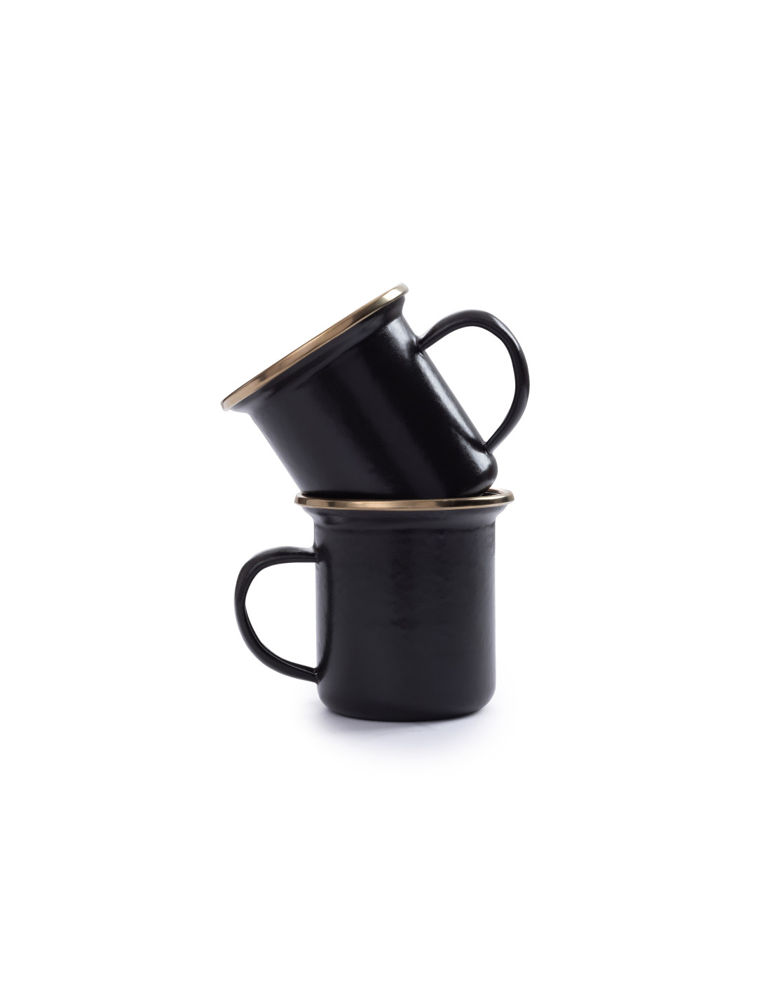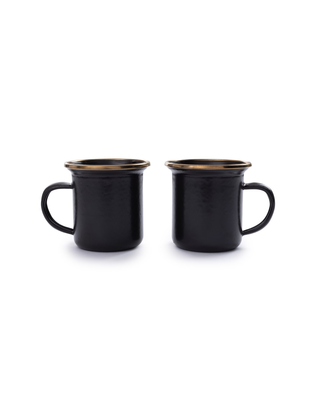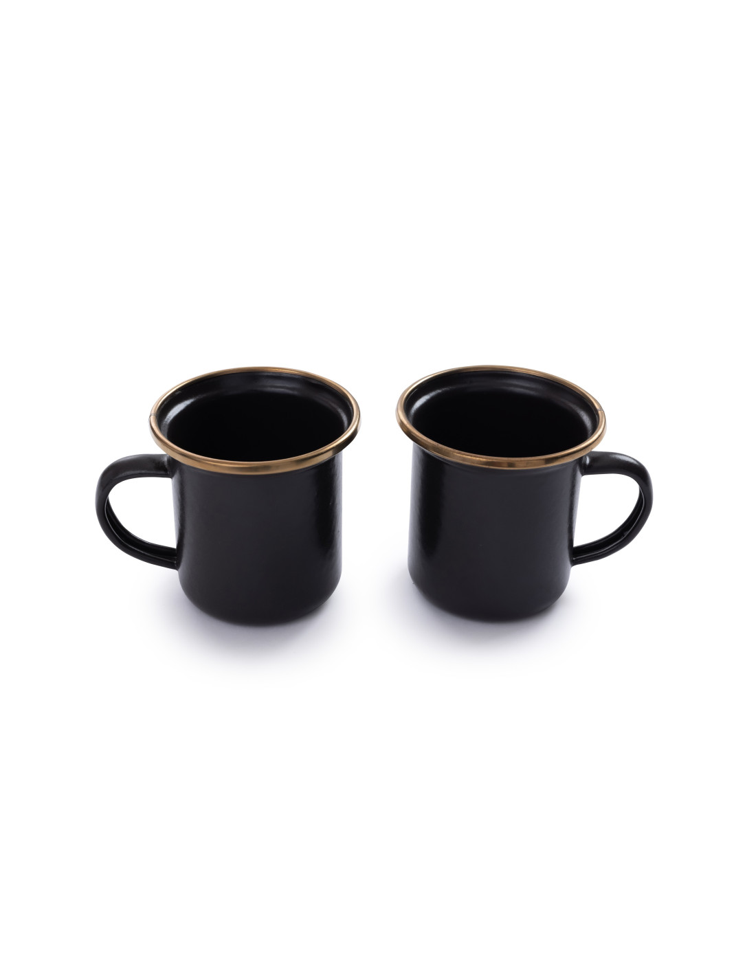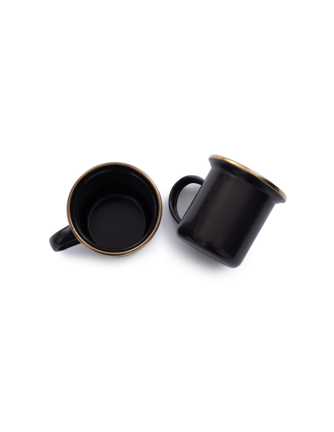 Set de 2 tasses à café, format expresso. Elles sont en acier émaillé avec la bordure en cuivre finie à la main. Chaque pièce est unique et elles forment un bel ensemble réunies sur la table.