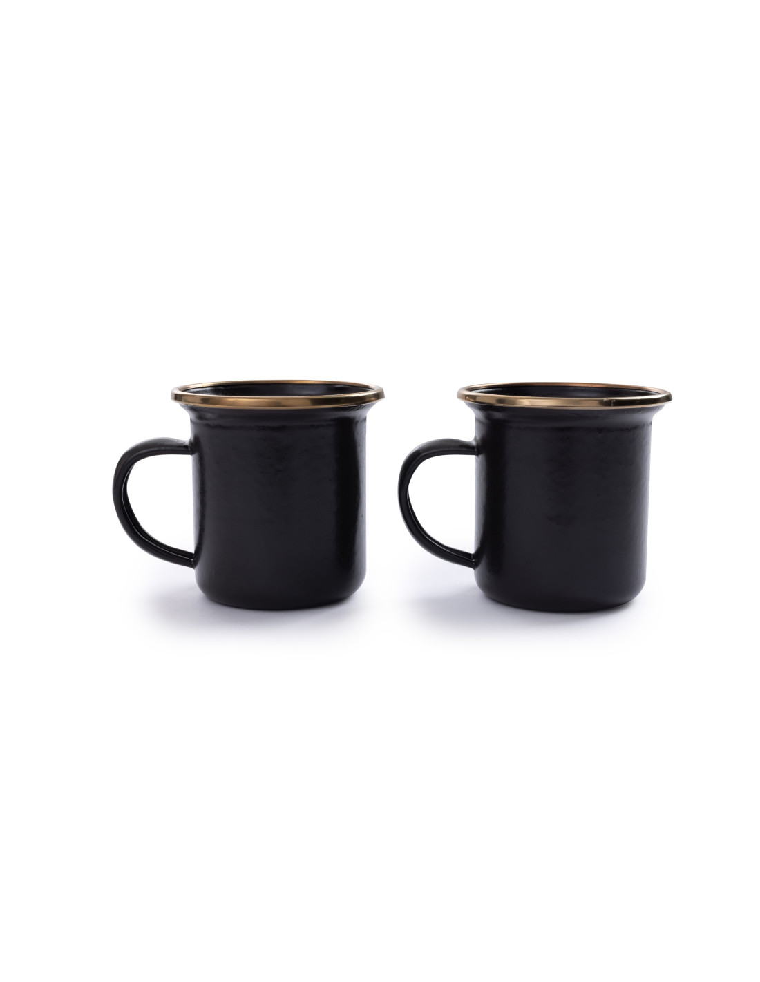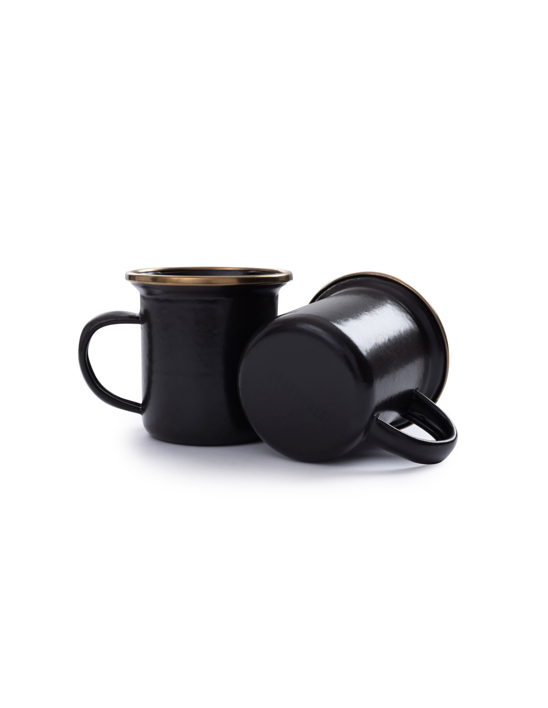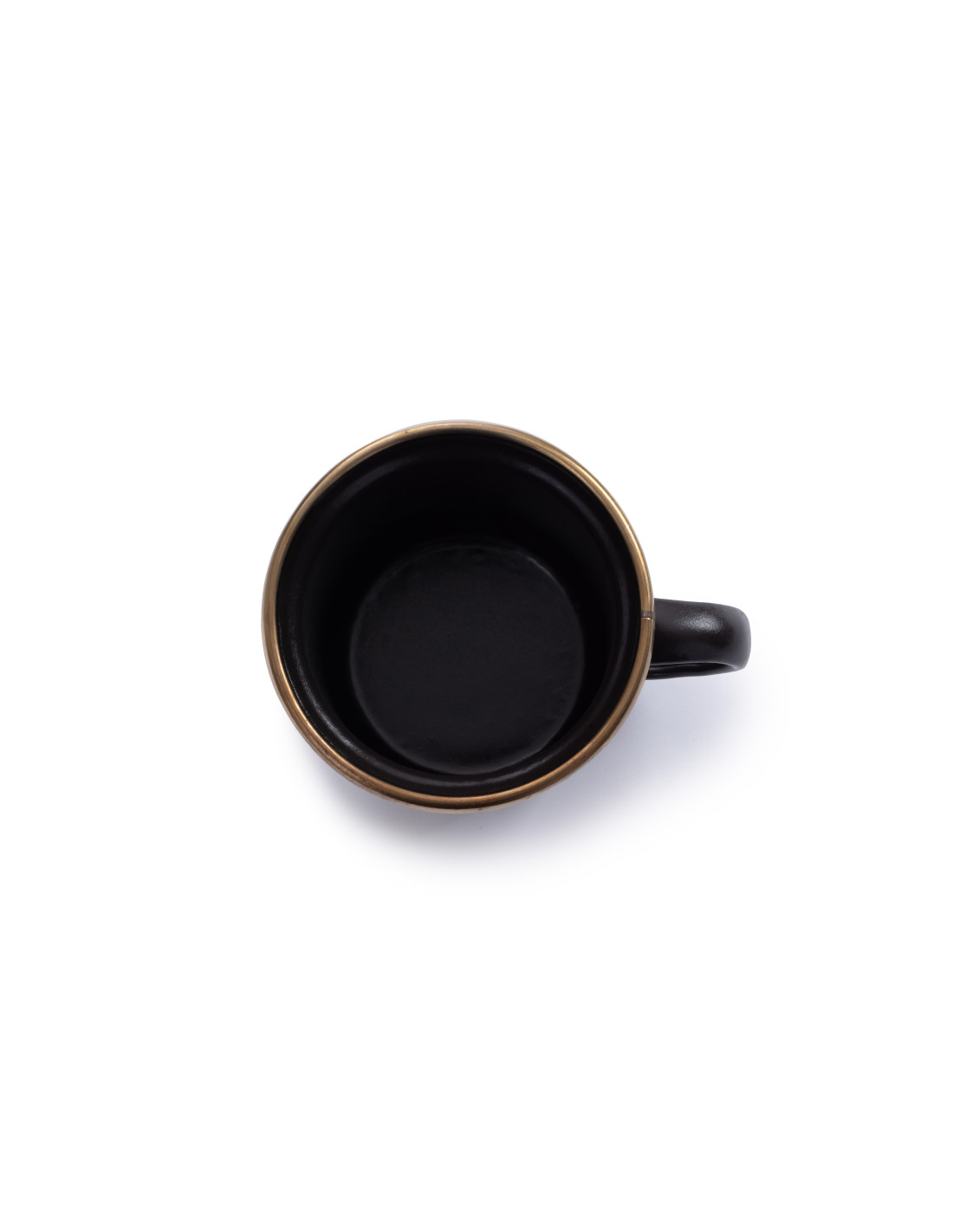 Set de 2 tasses à café, format expresso. Elles sont en acier émaillé avec la bordure en cuivre finie à la main. Chaque pièce est unique et elles forment un bel ensemble réunies sur la table.