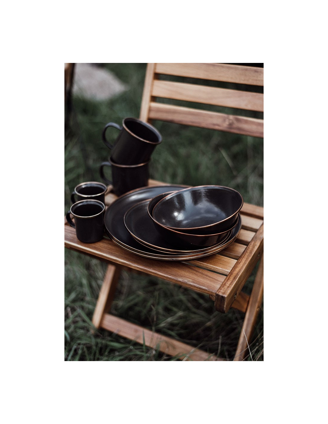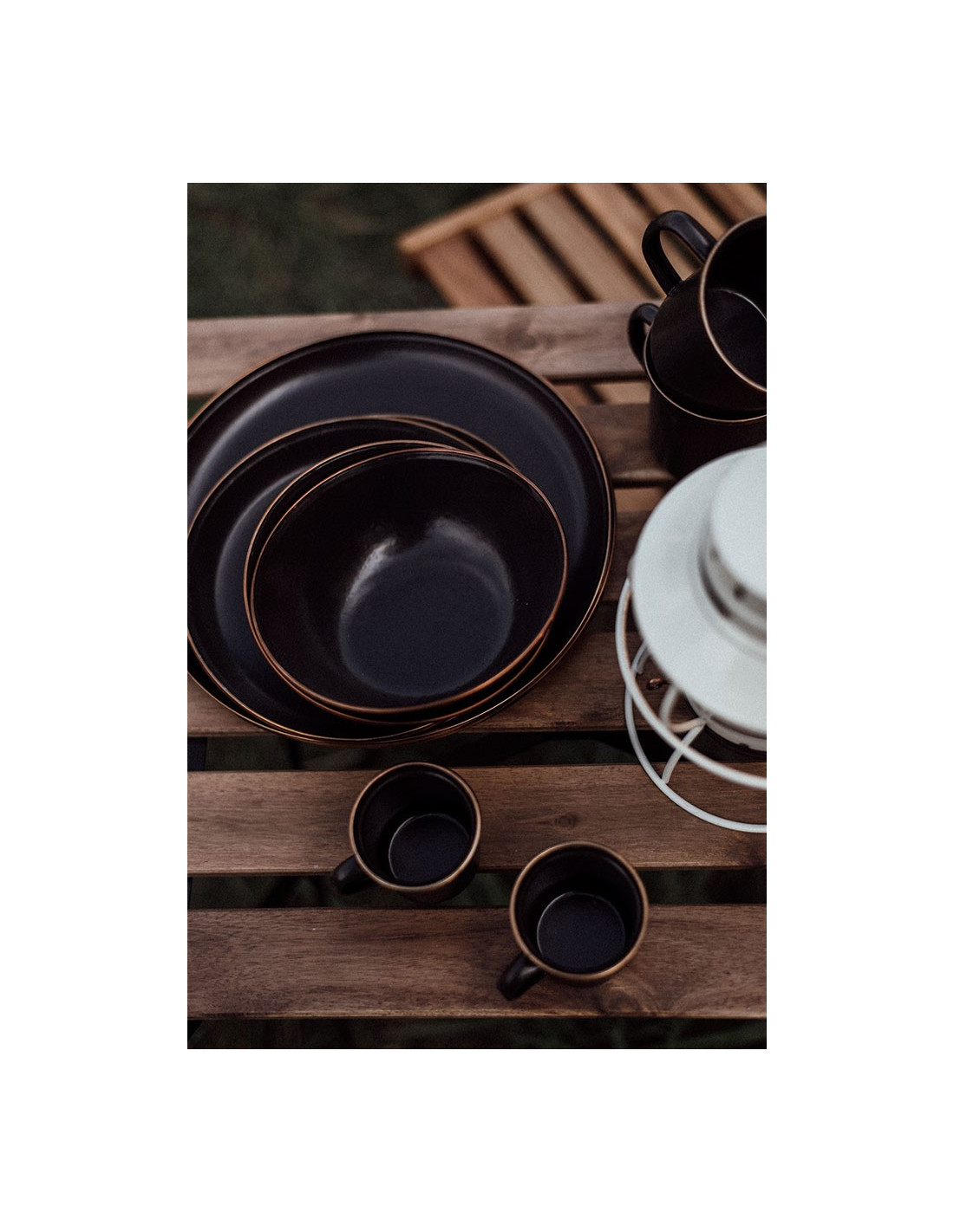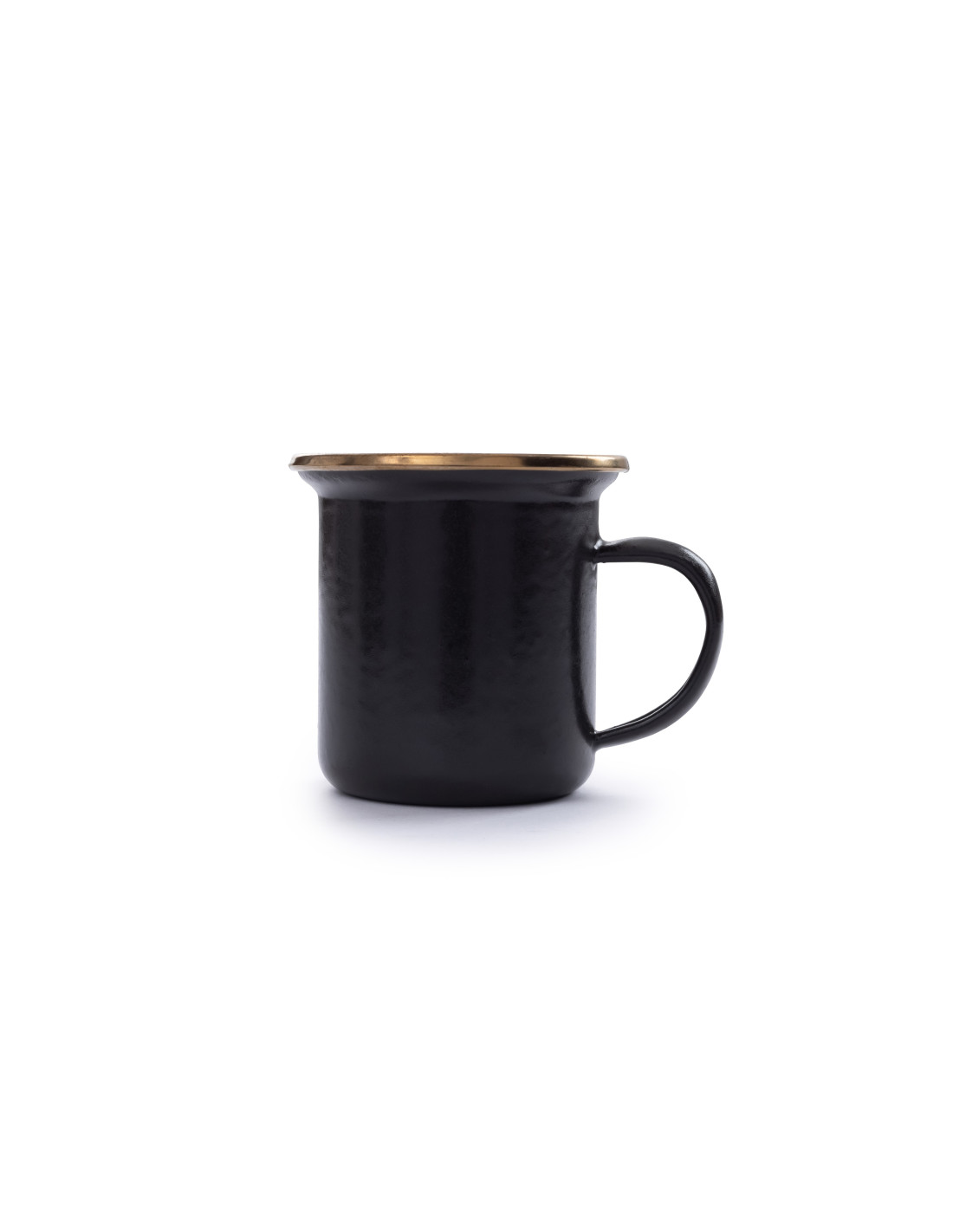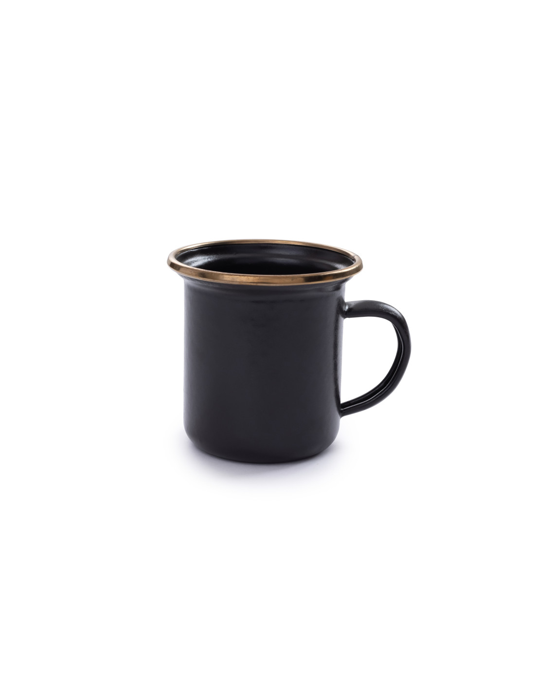 Set de 2 tasses à café, format expresso. Elles sont en acier émaillé avec la bordure en cuivre finie à la main. Chaque pièce est unique et elles forment un bel ensemble réunies sur la table.