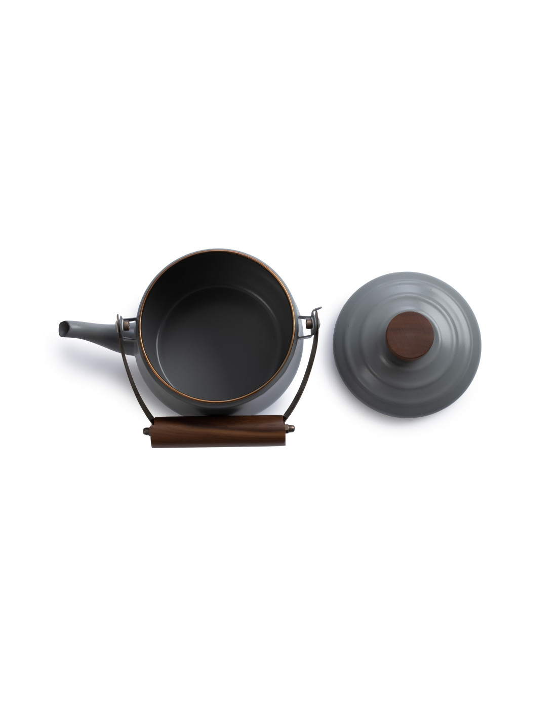 Théière en acier émaillé avec la bordure en cuivre finie à la main. Chaque pièce est unique..