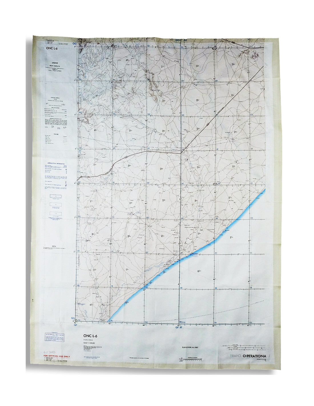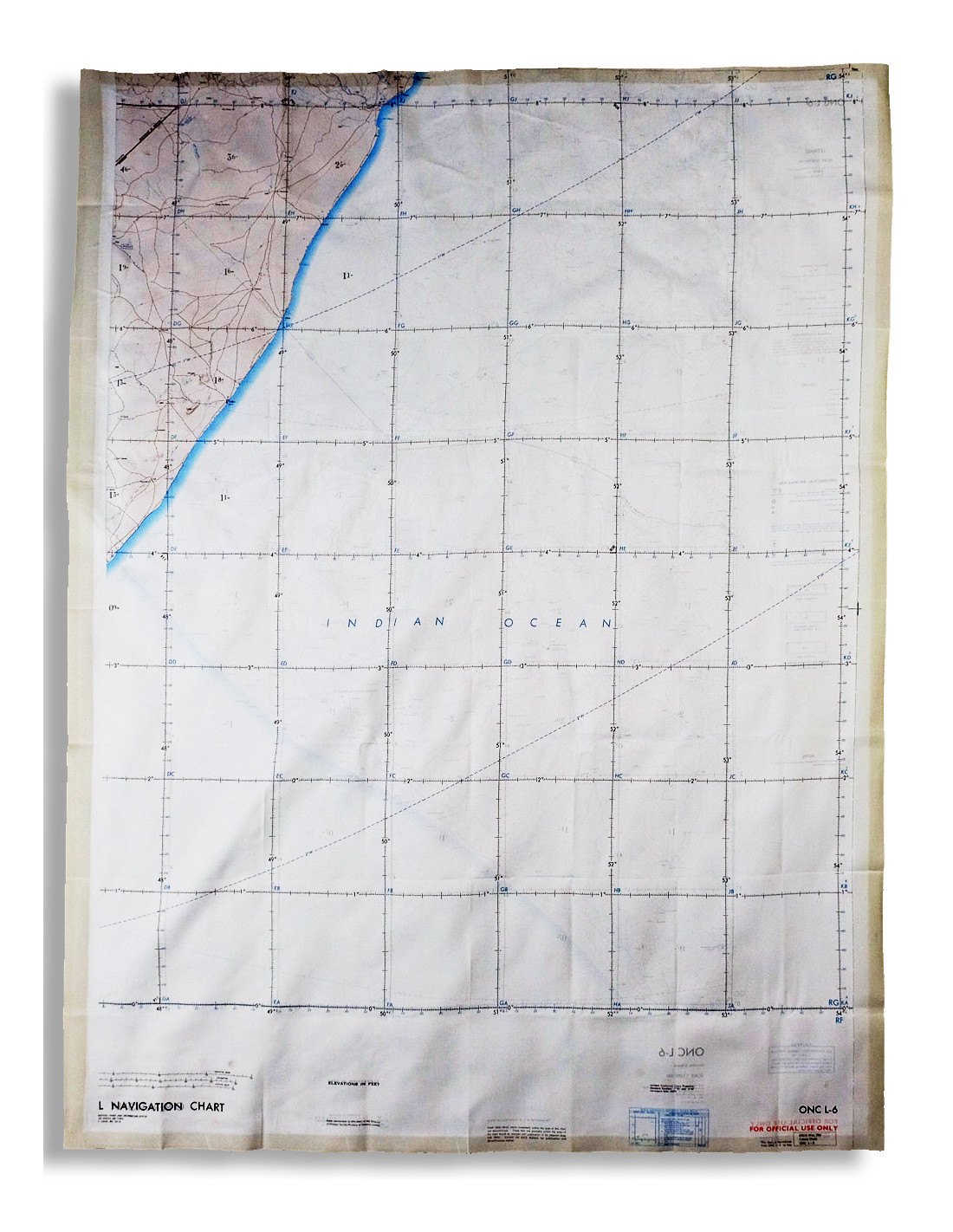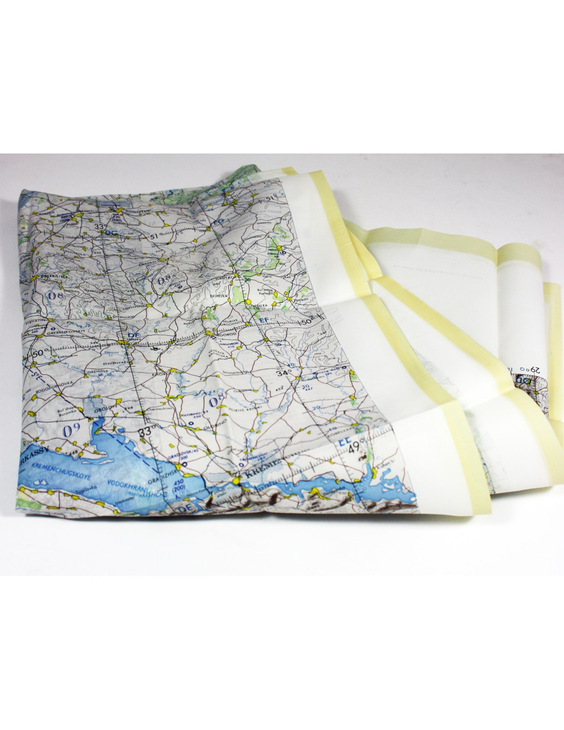 Ces foulards imprimés pendant les années 50 ou 60 proviennent d'un stock de l'OTAN. Les cartes imprimées sur les foulards servaient aux pilotes à se repérer, en particulier en cas de crash.