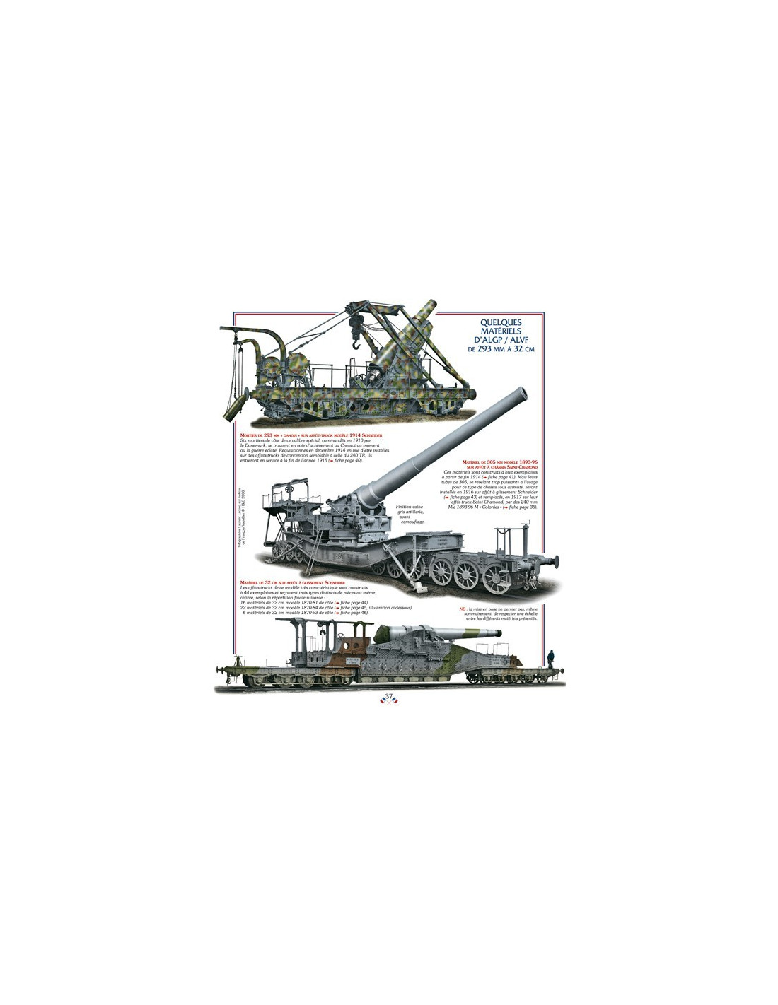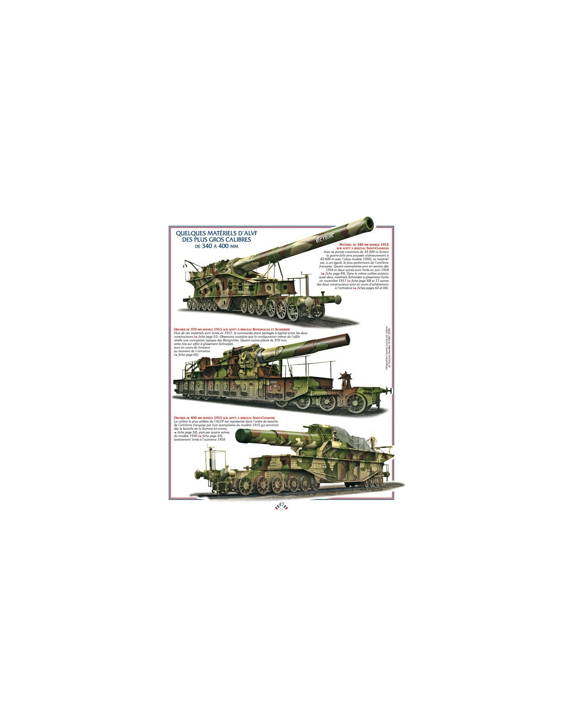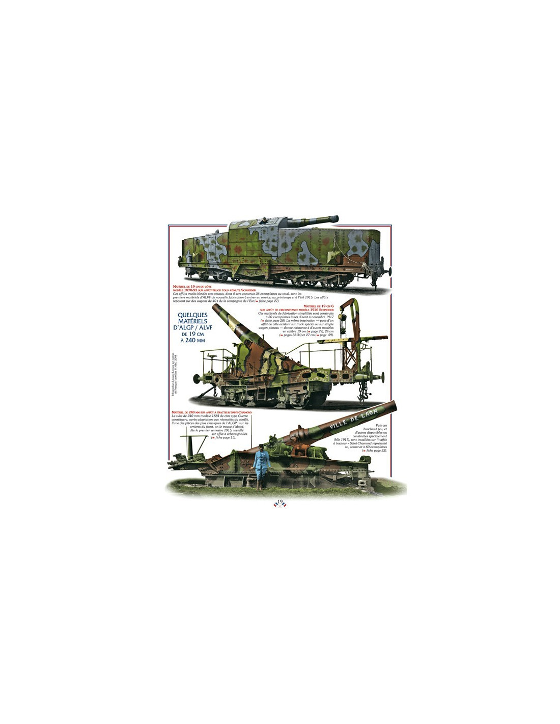 Mais dans cette course au gigantisme, la France a pris du retard, qu'elle va devoir combler à marche forcée. Les premières ressources en artillerie à grande puissance destinées à appuyer nos Poilus au fond des tranchées, sont fournies dès la fin de l'année 1914 par la marine qui met à terre, ou sur péniches et canonnières fluviales, des pièces de 100 mm, 14, 16, 19 et 24 cm. L'artillerie de côte fournit elle aussi des ressources analogues en bouches à feu, mais l'adaptation de ces pièces de bord et de côte à la guerre de position, sur terre, demande la mise au point d'affûts spéciaux, utilisant pour la majorité d'entre eux un support approprié : le rail. Ainsi naît une puissante artillerie lourde sur voie ferrée (ALVF), installée sur d'impressionnants affûts-trucks qui, au nombre de plusieurs centaines en 1918, seront les instruments d'un déluge d'acier. Ce petit volume très structuré passe en revue les quelques 49 matériels différents de ce genre, du modeste 95 mm de côte monté sur wagon blindé, jusqu'aux imposants matériels de 340, 370 et 400 mm, sans oublier le plus gigantesque de tous, l'obusier de 520 mm modèle 1916- 265 tonnes sur rail- dont!' obus pesait à lui seul plus de 1 600 kilos. 115 photographies et documents d'époque - 49 fiches techniques- 12 silhouettes en couleurs par Laurent Lecocq