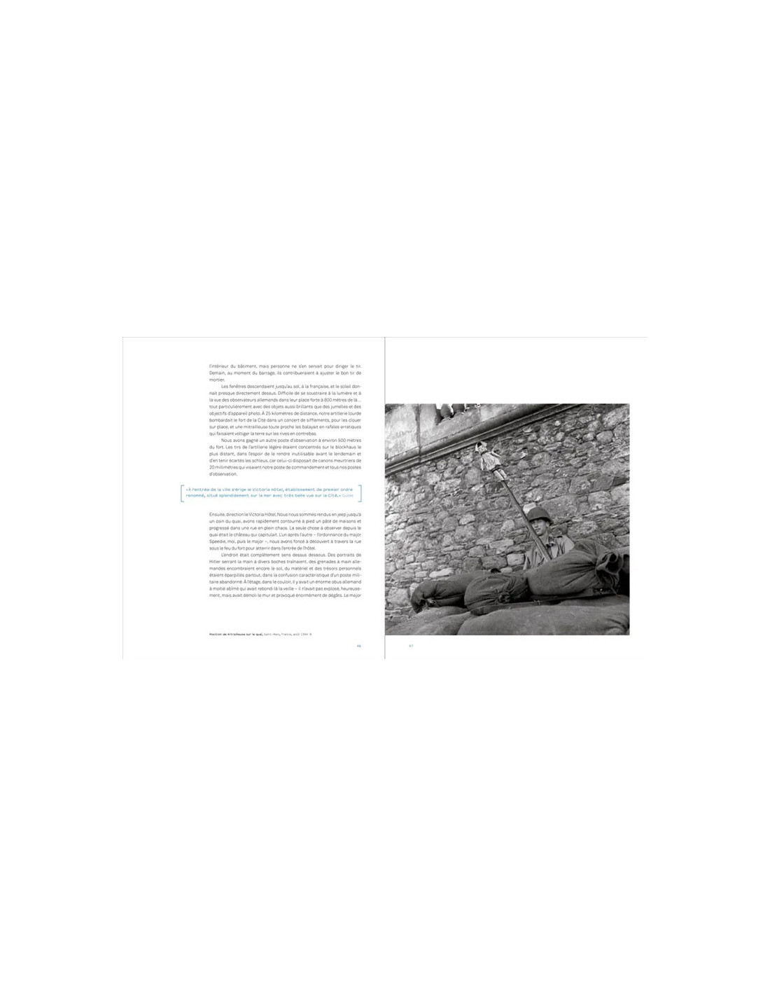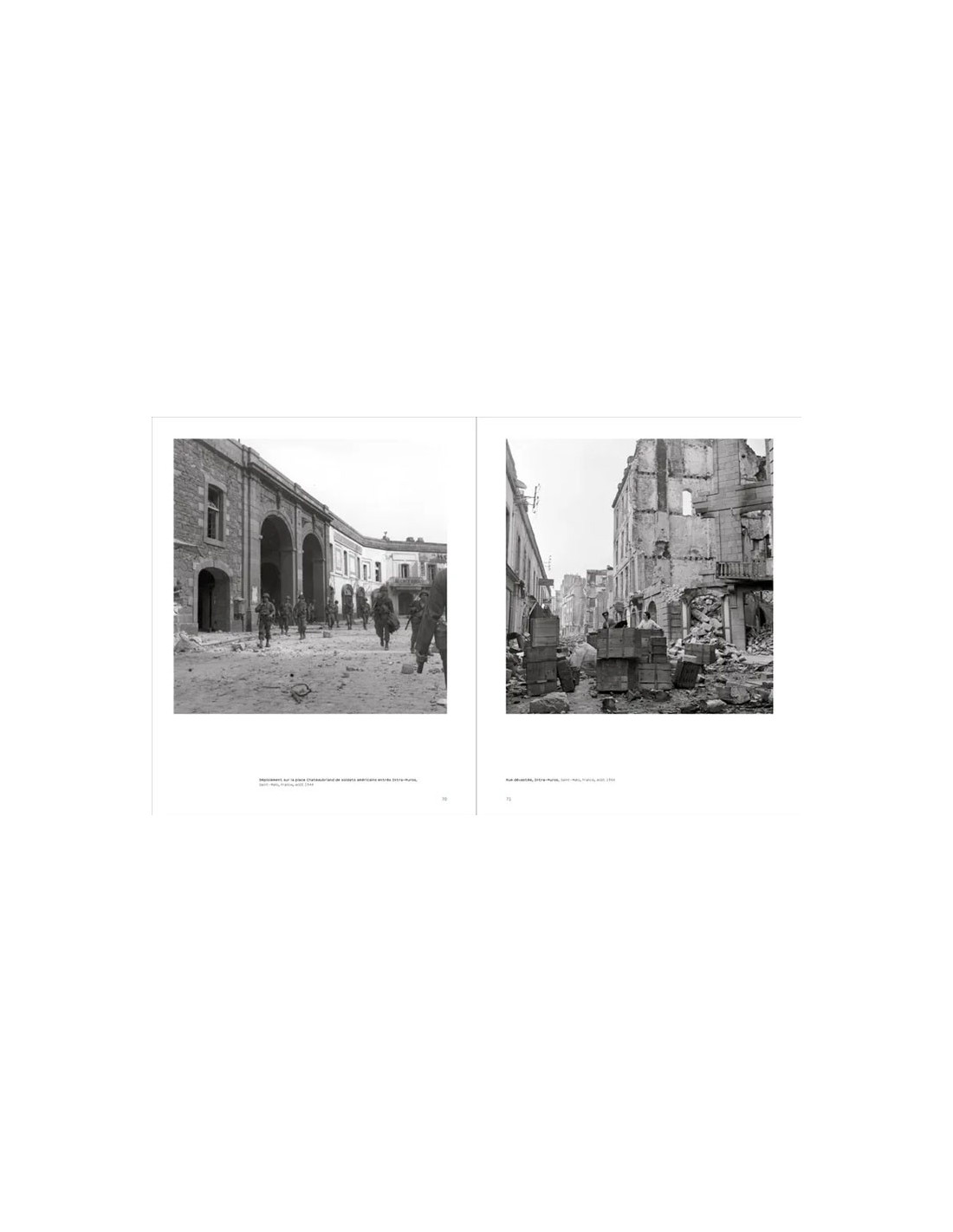 Elle photographie les réfugiés, vient en aide aux civils, pénètre dans la vieille ville dévastée et assiste à l’assaut final de la citadelle d’Alet, à son bombardement au napalm et à la reddition allemande.