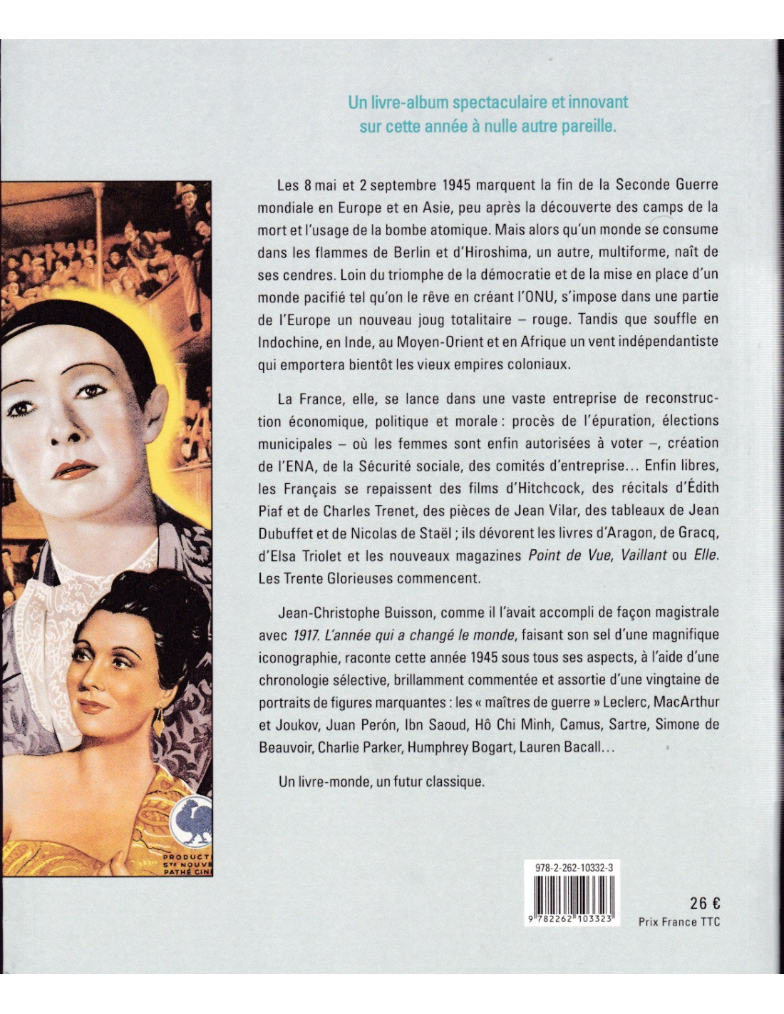 À ce titre, 1945 est une véritable année-charnière : un monde se consume dans les flammes, un autre renaît de ses cendres. Mais elle revêt plusieurs visages, et la fin des régimes de terreur bruns et noirs ne signifie pas le triomphe de la démocratie ni la mise en place d’un monde pacifié, tel qu’on le rêve à Yalta ou San Francisco avec la création annoncée de l’ONU. Ainsi la libération d’une partie de l’Europe s’accompagne-t-elle de l’instauration pour un demi-siècle d’un nouveau joug totalitaire – rouge. De Budapest à Sofia en passant par Belgrade, Varsovie, Bucarest et Prague, les pouvoirs se soviétisent peu à peu, inexorablement, tandis qu’en Indochine, en Inde, au Moyen-Orient, en Afrique du Nord, un vent indépendantiste souffle, qui emportera bientôt les empires coloniaux européens. Année à la fois de bousculement et de basculement, 1945 est racontée ici sous tous ses aspects – politiques, militaires, sociaux, culturels, géopolitiques –, au moyen d’une chronologie sélective, détaillée, commentée. Elle est, enfin, richement illustrée et rehaussée d’une vingtaine de portraits de figures marquantes axées sur leur rôle durant cette année emblématique : les généraux Leclerc, MacArthur et Joukov, Juan Peron, Ibn Séoud, Joukov, Hô Chi Minh, Camus, Sartre, Charlie Parker, Humphrey Bogart et Lauren Bacall…