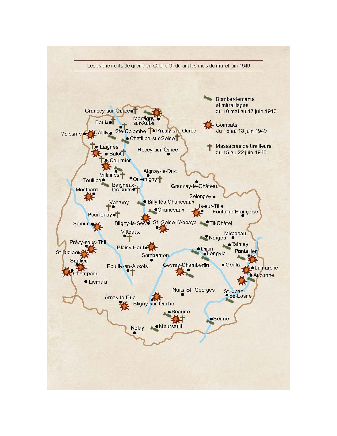 Bombardements, mitraillages, combats d’arrière-garde, pillages, exactions, massacres de prisonniers… jalonnèrent les routes, les villes et les villages de la Côte-d’Or encerclés par les unités SS et les panzerdivisons allemandes. Hommes, femmes, enfants, soldats d’infanterie, des unités blindées, des troupes coloniales… plus de 1 200 personnes furent tuées dans le département durant la campagne de France !