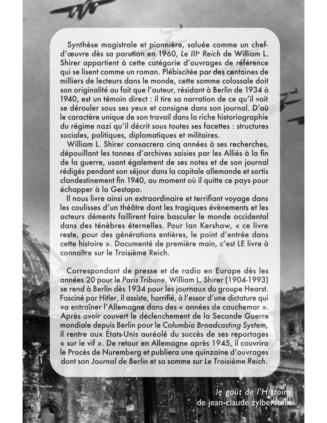 Il nous livre ainsi un extraordinaire et terrifiant voyage dans les coulisses d’un théâtre dont les tragiques évènements et les acteurs déments faillirent faire basculer le monde occidental dans des ténèbres éternelles. Pour Ian Kershaw, « ce livre reste, pour des générations entières, le point d’entrée dans cette histoire ». Documenté de première main, c’est LE livre à connaître sur le Troisième Reich.