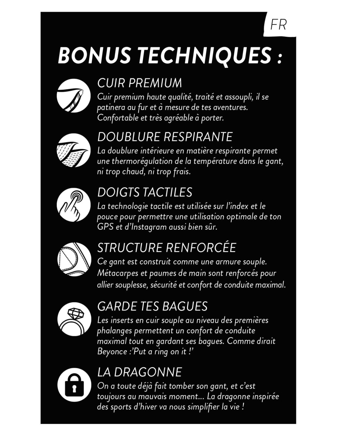 Le cuir de ce gant a été testé pour résister à l’abrasion et au déchirement. La forme allongée de la manchette permet d’enfiler facilement les gants et de couvrir cette partie en cas de glissade. Traité et assoupli, il saura se patiner au fur et à mesure de tes road trip et aventures. Un insert souple permet de laisser passer les bagues !