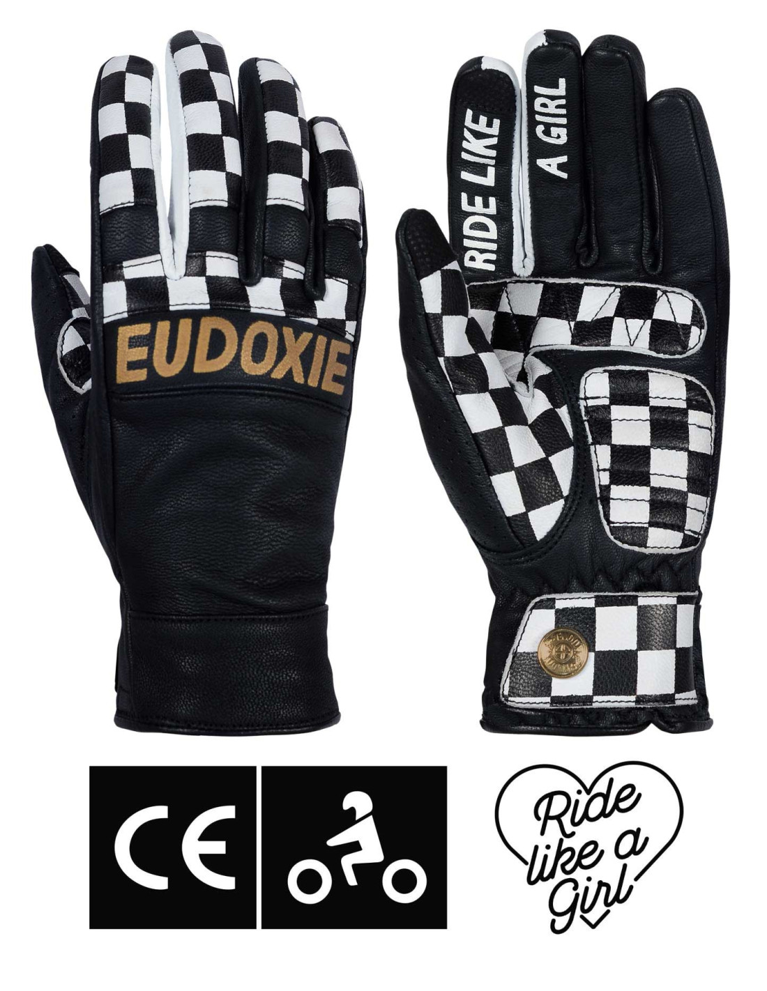 Retrouve le fun, le style et qualité unique à la Eudoxie ! Des gants uniques qu’on vous propose ici. Ils sont fins et proche de la main pour garantir une facilité de mouvement ainsi qu’un confort très appréciable lors de balade à moto. Ils se resserrent au poignet pour un meilleur maintien.