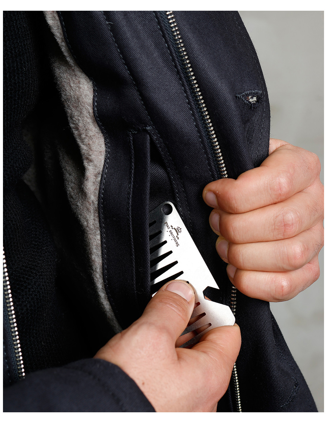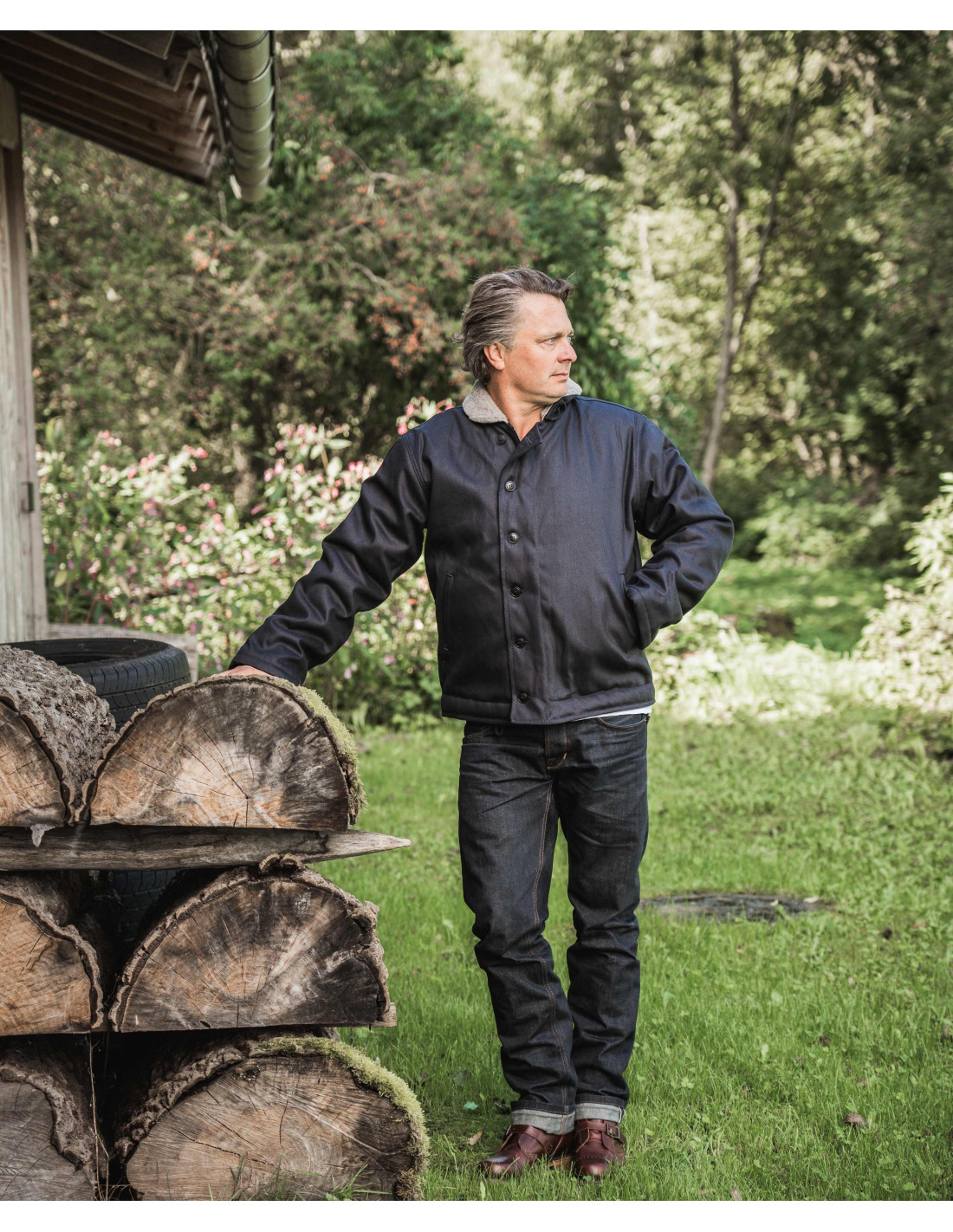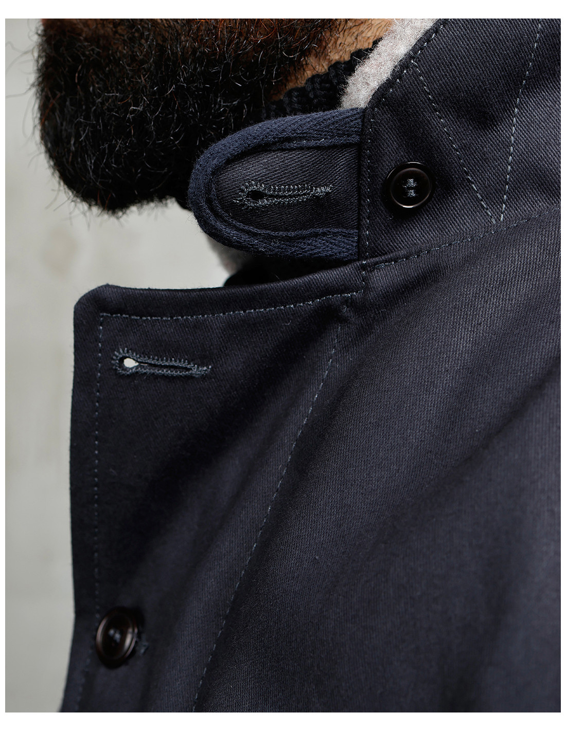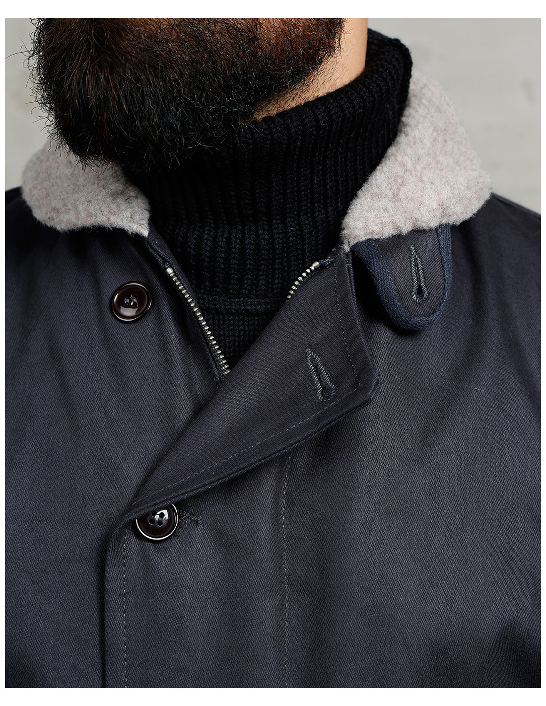 Cette N1 Deck-Jacket, comme l'originale, est composée d'un tissu extérieur serré, le « Jungle Cloth », associé à une doublure en laine tissée. Il en résulte une veste résistante à l'eau et au vent, protégeant la personne qui la porte des conditions météo les plus rigoureuses.