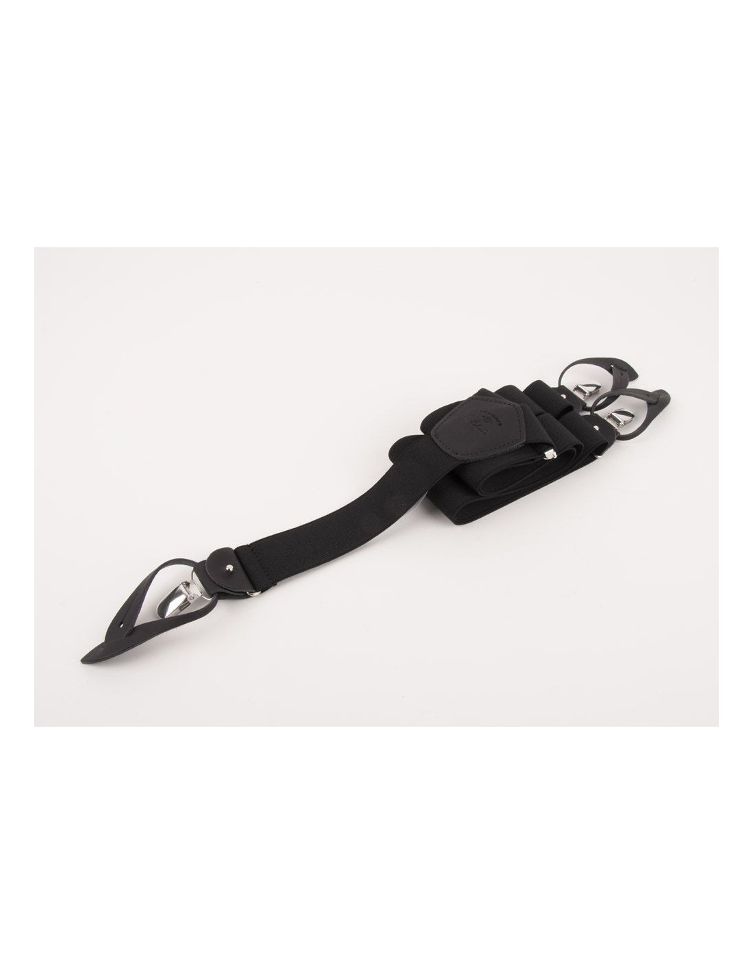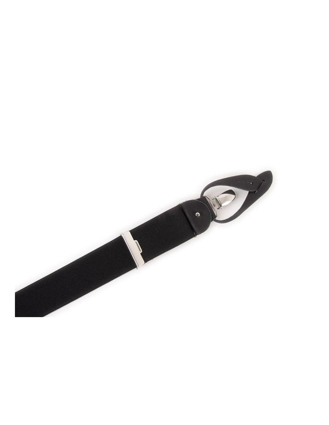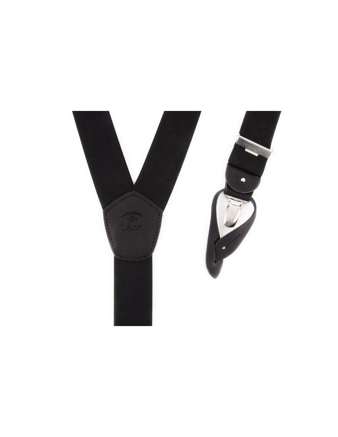 Bretelles pour Homme "Noir encre de Chine" " longues de 120 cm et large de 35 mm, elles se composent de bandes élastiques noire (82% Polyester et 18% Elastodienne) assemblées par un empiècement de cuir coloris noir (Cuir Pleine Fleur) estampillé "Les Bretelles de Léon".